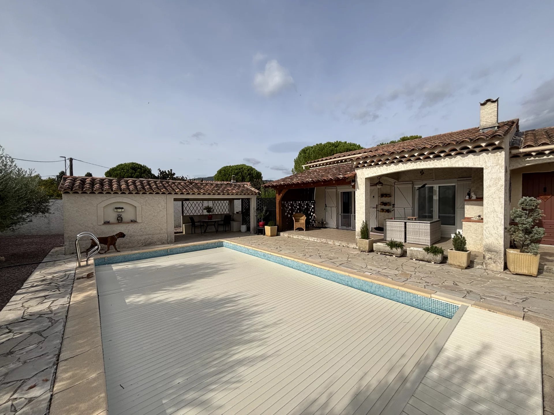 Le terrain joliment aménagé invite à la détente, autour de la piscine équipée d’un volet roulant pour plus de sécurité.